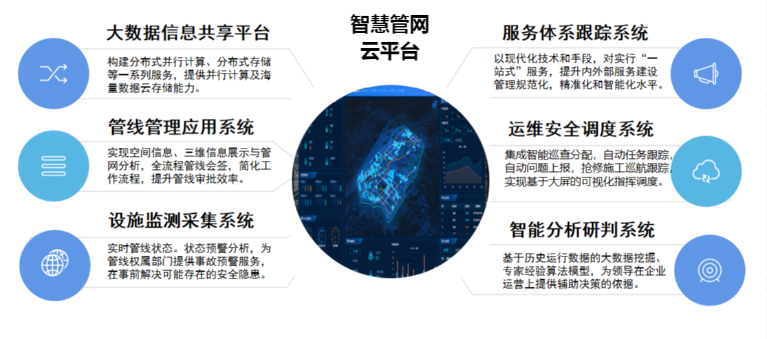 閃信管網智慧管理(lǐ)系統平台為(wèi)城(chéng)市(₽™ shì)管網建立有(yǒu)效的(de)管理(lǐ)運行(xíng∑₩✔)機(jī)制(zhì),面向政府決策層、管網®∏₽☆主管單位、權屬單位、相(xiàng)關職能(néng)¥♠↑×部門(mén)提供數(shù)據共享與交換、管♥$控與決策支持服務,實現(xiàn)城(chéng)市(shì)管<€↕網信息的(de)即時(shí)交換、智能(néng)分(fēn↑¶)析和(hé)動态更新,使城(chéng)市( ↑shì)管網在規劃建設和(hé)管理(lǐ)中真&$≥ 正起到(dào)基礎性的(de)保障和(hé)服務作(zuò)用(yòngπ∞←&),最終實現(xiàn)城(chéng)市(shì)管網的(de)高(gāoβ)效監管、有(yǒu)序建設和(hé)規範¶¶★化(huà)管理(lǐ)。